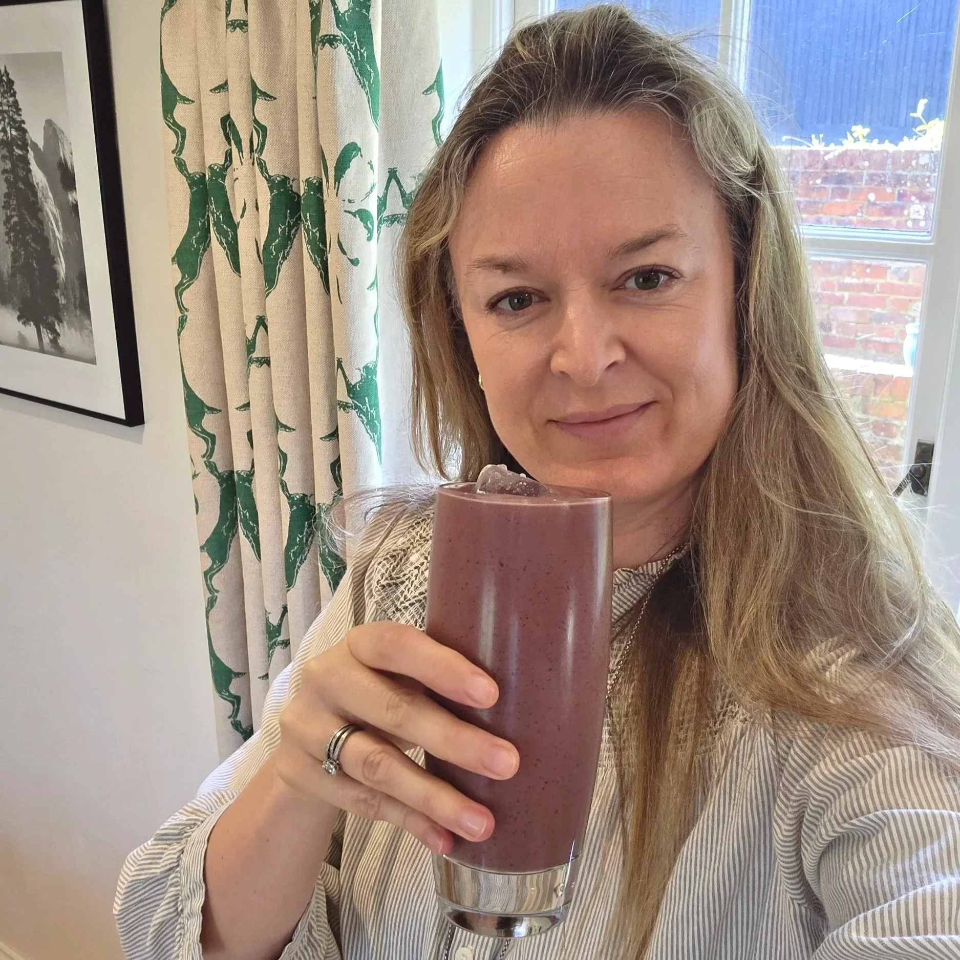 Method: blend all ingredients until silky smooth, top with an ice cube. I love smoothies because they travel well and are equally quick in a glass at your desk.