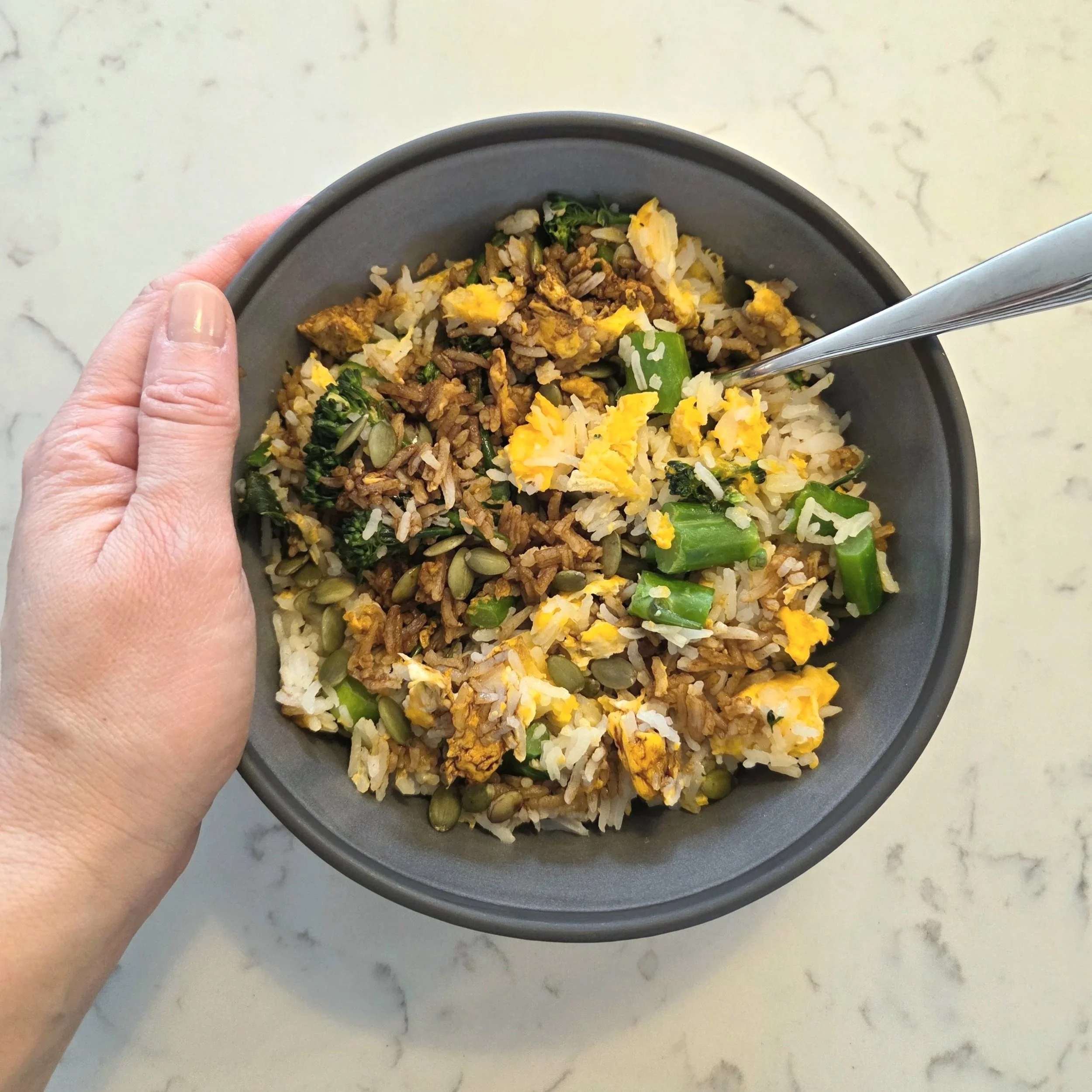 The rice you are using is leftover and has been in the fridge (*keeps in tupperware for three days). This gives you resistant starch which feeds gut bugs, supports neurotransmitters but does not elevate blood sugar.
